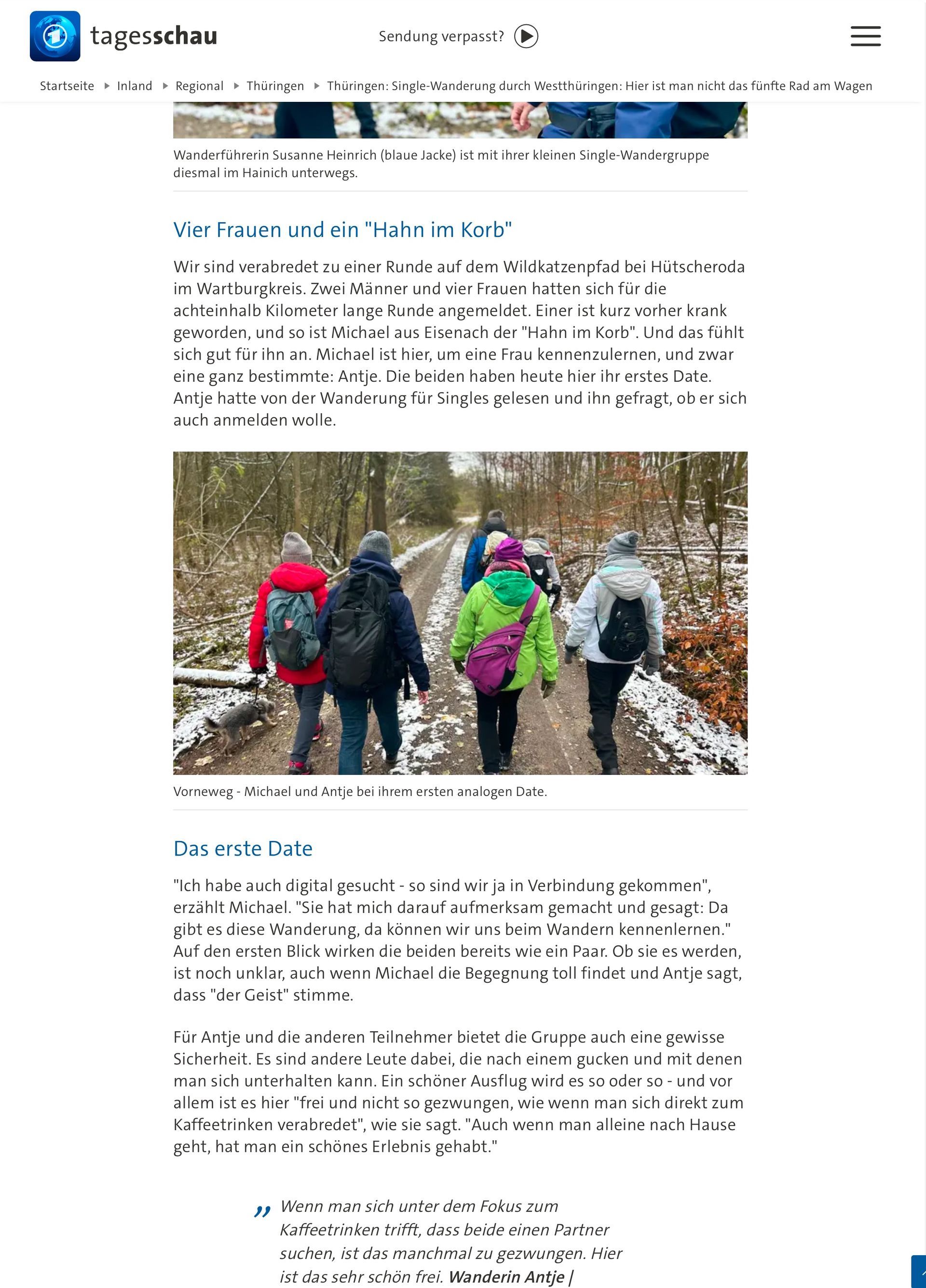 Für alle, die es verpasst haben oder gerne noch mal sehen möchten, hier der Beitrag vom WDR in "Frau tv". Ein toller Bericht, bei dem es gelungen ist, die ungezwungene Atmosphäre und positive Stimmung einzufangen und an den Zuschauer zu transportieren. Ein schöner Einblick wie unsere Singlewanderungen ablaufen. Der WDR hat uns bei einer Wanderung am Möhnesee begleitet.